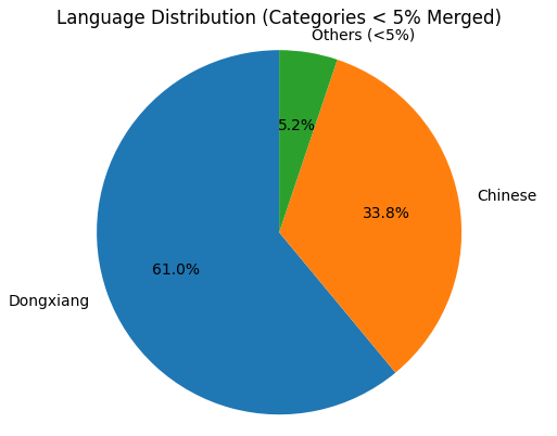 Although it is still classified under the Mongolic language family, due to the prolonged coexistence with Mandarin-speaking communities through history, the language has a trove of lexical borrowing from Chinese (Mandarin). Dongxiang exhibits no overt tense inflection or grammatical gender, which may be an advantage to simplify our model training.